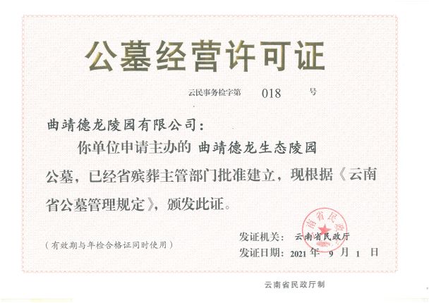 德龍園聚翠山之靈秀,依文脈而規(guī)劃,經(jīng)云南省民政廳批準(zhǔn)建設(shè),規(guī)劃用地一共520畝,經(jīng)過(guò)精心設(shè)計(jì),精細(xì)施工,于2021年9月取得《公墓經(jīng)營(yíng)許可證》并投入使用。